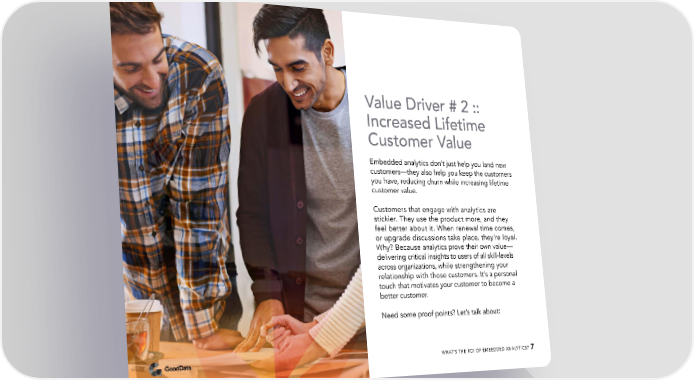 Value Driver # 2 :: Increased Lifetime Customer Value Embedded analytics don’t just help you land new customers—they also help you keep the customers you have, reducing churn while increasing lifetime customer value. Customers that engage with analytics are stickier. They use the product more, and they feel better about it. When renewal time comes, or upgrade discussions take place, they’re loyal. Why? Because analytics prove their own value— delivering critical insights to users of all skill-levels across organizations, while strengthening your relationship with those customers. It’s a personal touch that motivates your customer to become a better customer. Need some proof points? Let’s talk about: WHAT’S THE ROI OF EMBEDDED ANALYTICS? 7