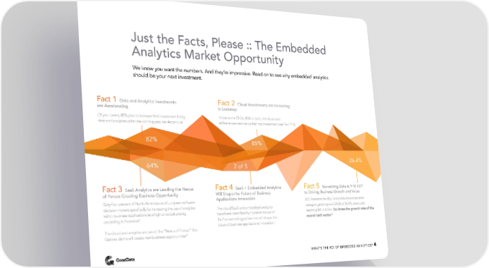 Just the Facts, Please :: The Embedded Analytics Market Opportunity We know you want the numbers. And they’re impressive. Read on to see why embedded analytics should be your next investment. Fact 1 Data and Analytics Investments Fact 2 Cloud Investments are Increasing are Accelerating in Lockstep Of your peers, 82% plan to increase their investment in big Those same CFOs, 85% in total, cite cloud and 1 1 data and analytics within the coming year, per Accenture. software-as-a-service as their top investment area for FY’16. 82% 85% 64% 2 of 5 26.4% Fact 3 SaaS Analytics are Leading the Nexus Fact 4 SaaS + Embedded Analytics Fact 5 Monetizing Data is THE KEY of Forces Creating Business Opportunity Will Shape the Future of Business to Driving Business Growth and Value Sixty-four percent of North American and European software Applications Innovation IDC forecasts the Big Data products and services decision-makers specifically list increasing the use of analytics The cloud/SaaS and embedded analytics category growing at a CAGR of 26.4%, eventually within business applications as a high or critical priority, have been identified by Forrester as two of reaching $41.5 billion. Six times the growth rate of the 3 5 according to Forrester. the five technology pillars that will shape the overall tech sector. future of business applications innovation.3 The cloud and analytics are two of the “Nexus of Forces” that 4 Gartner claims will create new business opportunities. WHAT’S THE ROI OF EMBEDDED ANALYTICS? 4