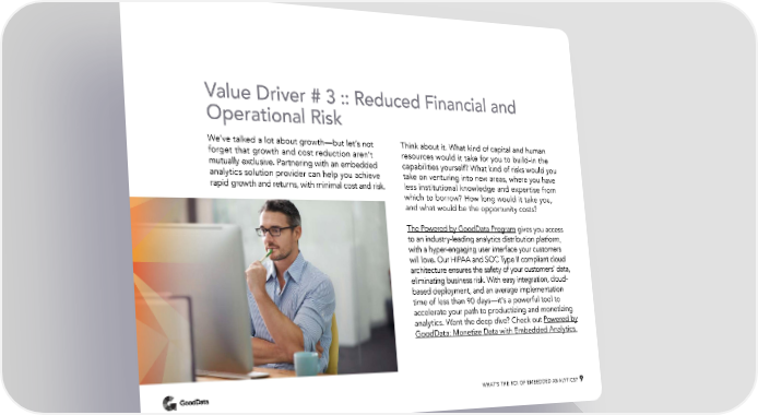 Value Driver # 3 :: Reduced Financial and Operational Risk We’ve talked a lot about growth—but let’s not Think about it. What kind of capital and human forget that growth and cost reduction aren’t resources would it take for you to build-in the mutually exclusive. Partnering with an embedded capabilities yourself? What kind of risks would you analytics solution provider can help you achieve take on venturing into new areas, where you have rapid growth and returns, with minimal cost and risk. less institutional knowledge and expertise from which to borrow? How long would it take you, and what would be the opportunity costs? The Powered by GoodData Program gives you access to an industry-leading analytics distribution platform, with a hyper-engaging user interface your customers will love. Our HIPAA and SOC Type II compliant cloud architecture ensures the safety of your customers’ data, eliminating business risk. With easy integration, cloud- based deployment, and an average implementation time of less than 90 days—it’s a powerful tool to accelerate your path to productizing and monetizing analytics. Want the deep dive? Check out Powered by GoodData: Monetize Data with Embedded Analytics. WHAT’S THE ROI OF EMBEDDED ANALYTICS? 9