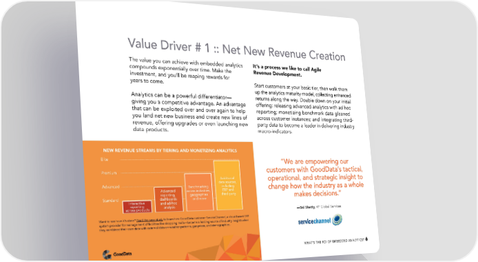 Value Driver # 1 :: Net New Revenue Creation The value you can achieve with embedded analytics It’s a process we like to call Agile compounds exponentially over time. Make the Revenue Development. investment, and you’ll be reaping rewards for years to come. Start customers at your basic tier, then walk them up the analytics maturity model, collecting enhanced Analytics can be a powerful differentiator— returns along the way. Double down on your initial giving you a competitive advantage. An advantage offering: releasing advanced analytics with ad hoc that can be exploited over and over again to help reporting; monetizing benchmark data gleaned you land net new business and create new lines of across customer instances; and integrating third- revenue, offering upgrades or even launching new party data to become a leader in delivering industry data products. macro-indicators. NEW REVENUE STREAMS BY TIERING AND MONETIZING ANALYTICS Elite “We are empowering our Premium customers with GoodData’s tactical, Additional operational, and strategic insight to Advanced data sources, Advanced Benchmarking including change how the industry as a whole reporting, across industries, ERP and Standard dashboards geographies third-party makes decisions.” Interactive and ad-hoc and more reporting analysis across products —Sid Shetty, VP Global Services Want to see how it’s done? Read the case study to learn how GoodData customer ServiceChannel, a cloud-based ERP system provider for management of facilities like shopping malls—became a leading source of industry insights when they combined their own data with external data on weather patterns, gas prices, and demographics. WHAT’S THE ROI OF EMBEDDED ANALYTICS? 6