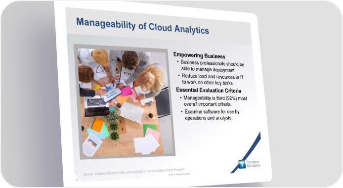 Manageability of Cloud Analytics Empowering Business • Business professionals should be able to manage deployment. • Reduce load and resources in IT to work on other key tasks. Essential Evaluation Criteria • Manageability is third (92%) most overall important criteria. • Examine software for use by operations and analysts. Source: Ventana Research Data and Analytics in the Cloud Benchmark Research 13 © 2015 Ventana Research