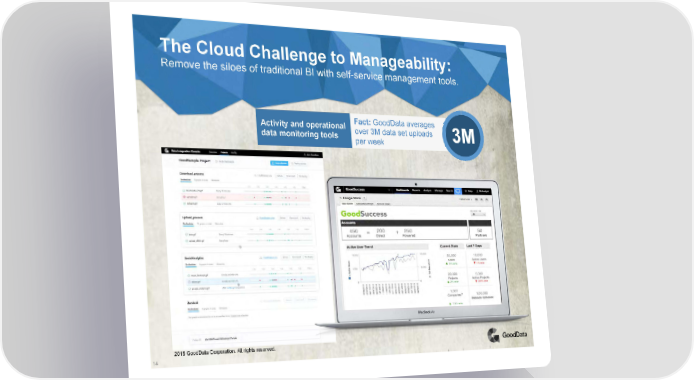 The Cloud Challenge to Manageability: Remove the siloes of traditional BI with self-service management tools. Activity and operational Fact: GoodData averages data monitoring tools over 3M data set uploads 3M per week 2015 GoodData Corporation. All rights reserved. 14