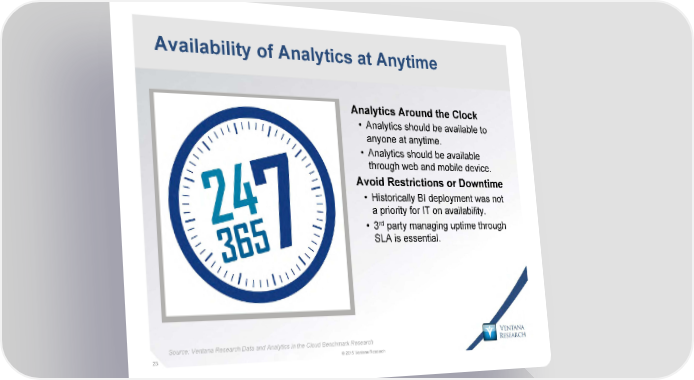 Availability of Analytics at Anytime Analytics Around the Clock • Analytics should be available to anyone at anytime. • Analytics should be available through web and mobile device. Avoid Restrictions or Downtime • Historically BI deployment was not a priority for IT on availability. rd • 3 party managing uptime through SLA is essential. Source: Ventana Research Data and Analytics in the Cloud Benchmark Research 23 © 2015 Ventana Research