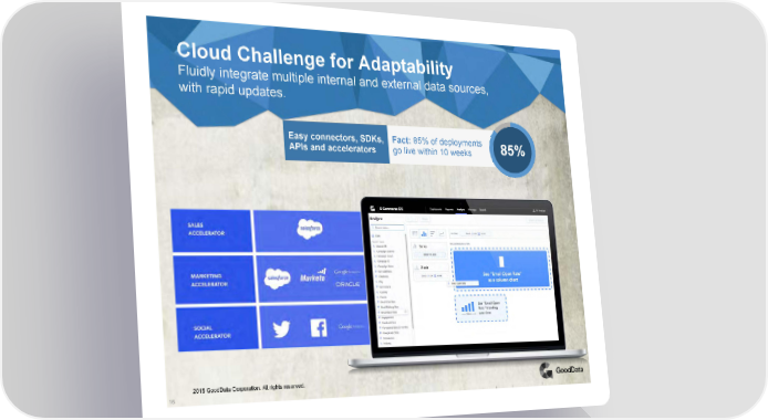 Cloud Challenge for Adaptability Fluidly integrate multiple internal and external data sources, with rapid updates. Easy connectors, SDKs, Fact: 85% of deployments 85% APIs and accelerators go live within 10 weeks 2015 GoodData Corporation. All rights reserved. 16